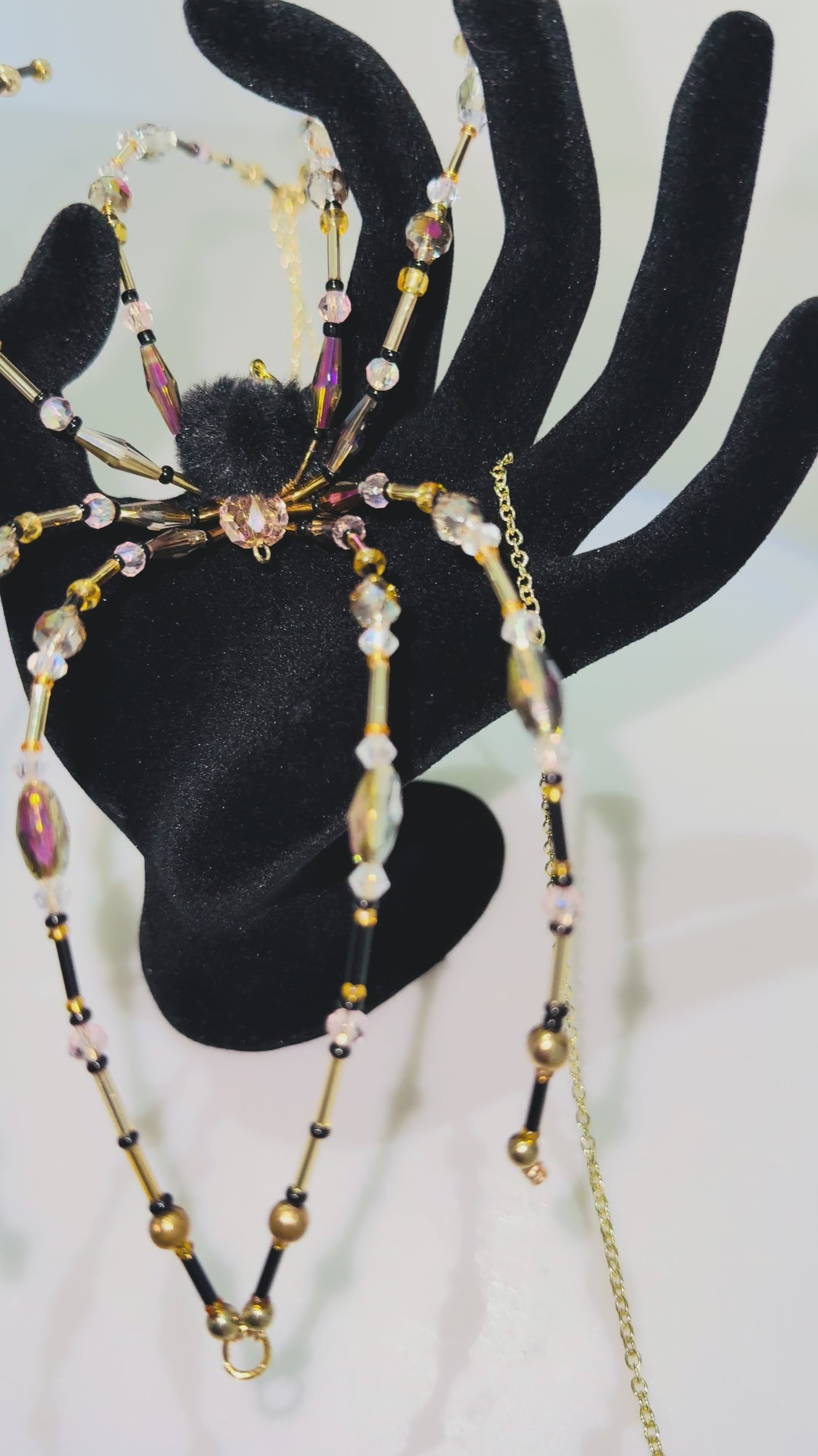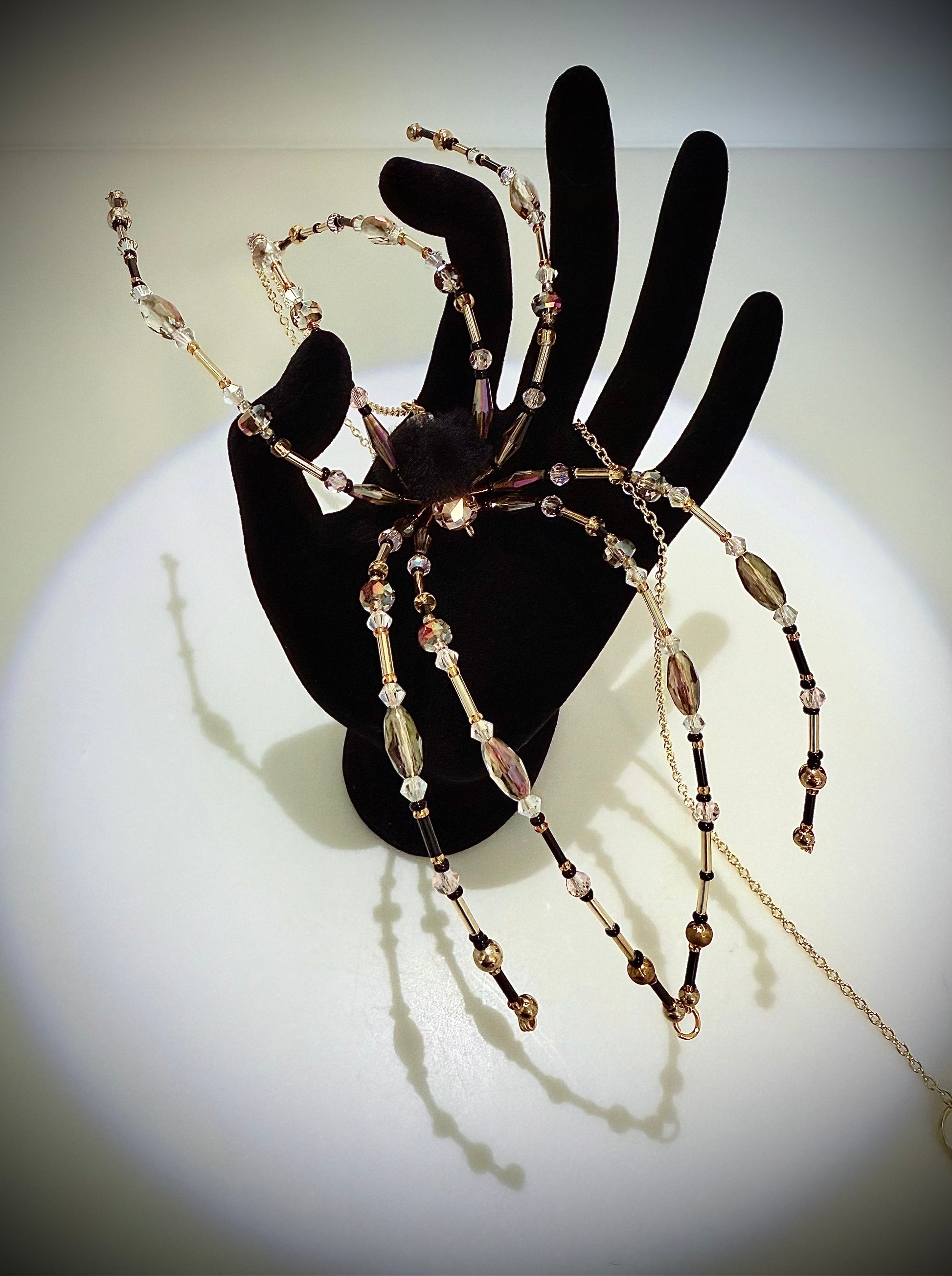 A piece that whispers elegance with every shimmer — the Amber Veil Spider is handcrafted with golden-hued glass beads and smoky accents that catch the light like strands of spun silk. Each leg is delicately beaded to create a flowing, lifelike grace, while the faceted body gleams with warmth, evoking the glow of candlelight in a twilight room.
