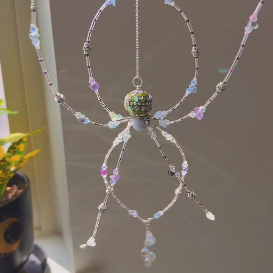 Delicately handmade with iridescent glass beads and soft pastel tones, this beaded spider captures light like a dream. Each leg is adorned with amethyst and green quartz stones, and its ornate body glows with quiet magic.