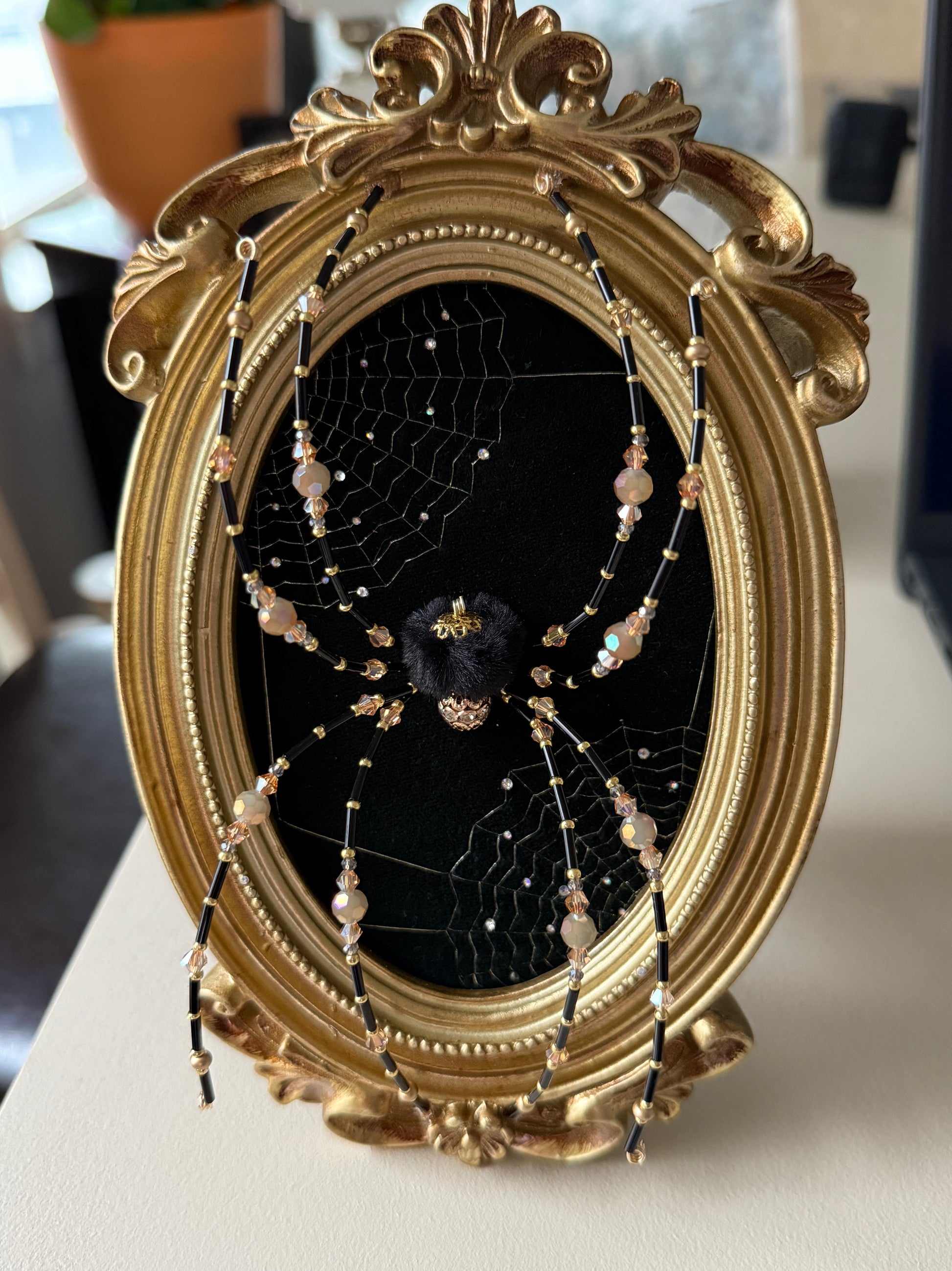 One of my original spiders but instead of a wire web she’s in a decorative frame with hand stitched webs. First of many I will be making! I hope you enjoy.