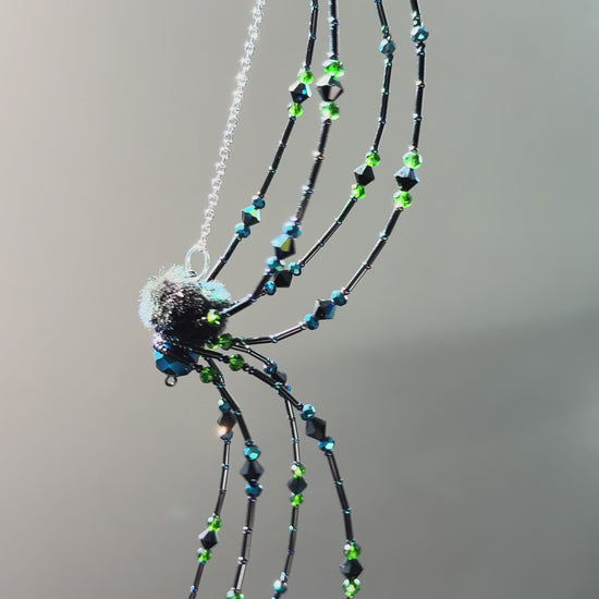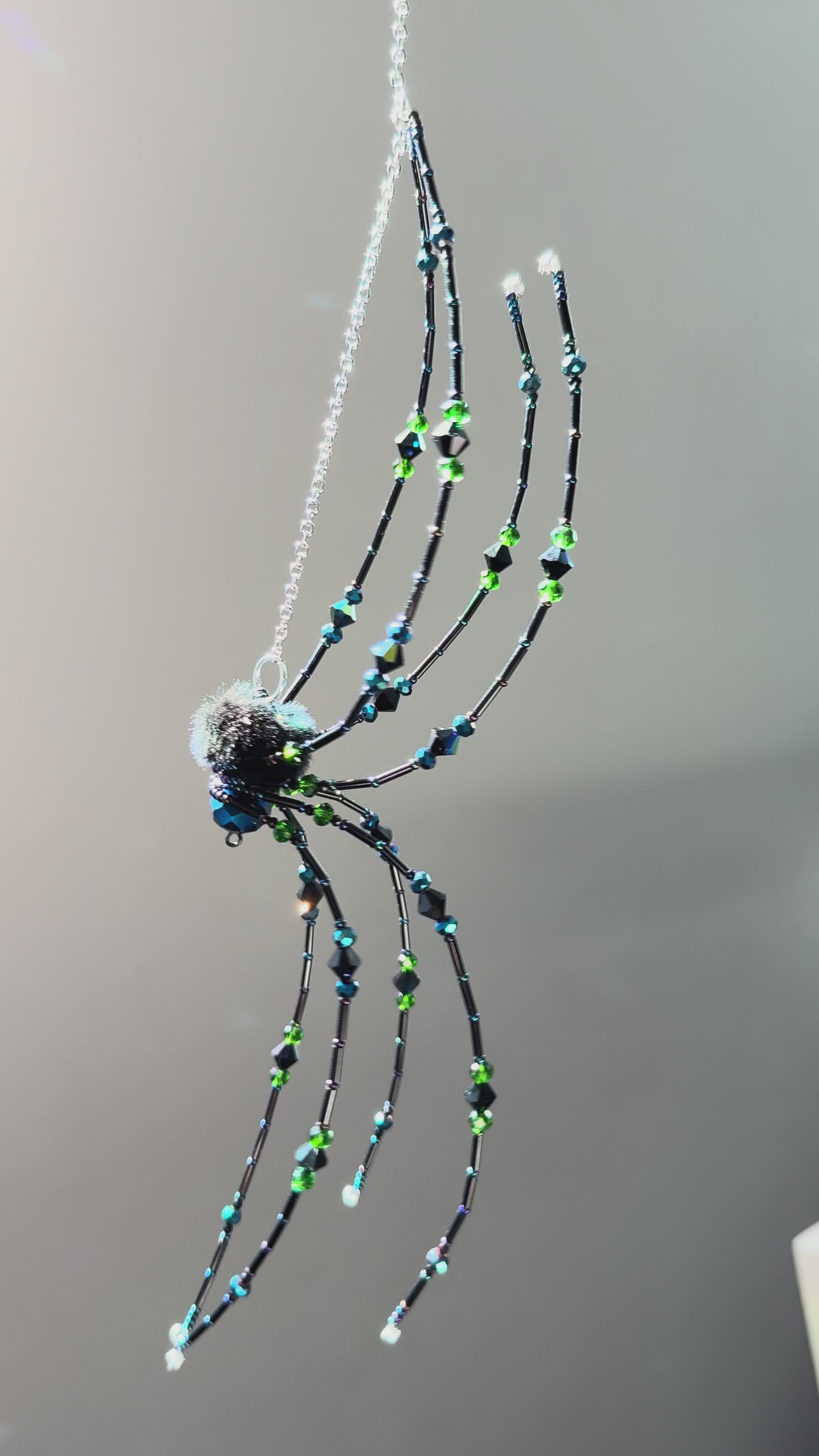Goblin King Spider. This king is 10” toe to toe. Hanging chain included. Featuring blues, greens, purples and a fuzzy bum!