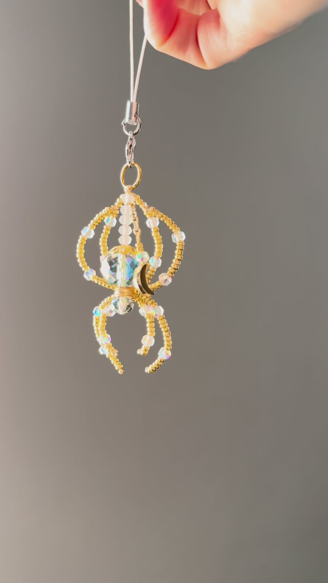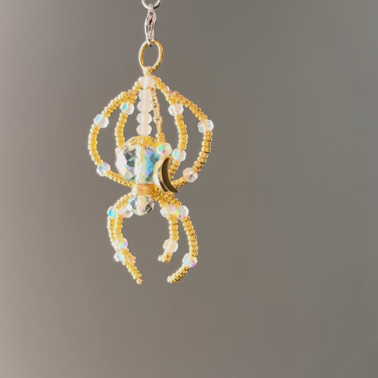 She began as a phone charm, but quickly outgrew the role. This golden beaded spider shimmers with iridescent glass and delicate crystal accents, catching the light from every angle. Handmade with love and intention, she’s the kind of piece that belongs wherever the light finds her—hung in your car, worn around your neck, dancing in your window, or clipped to your favorite bag.