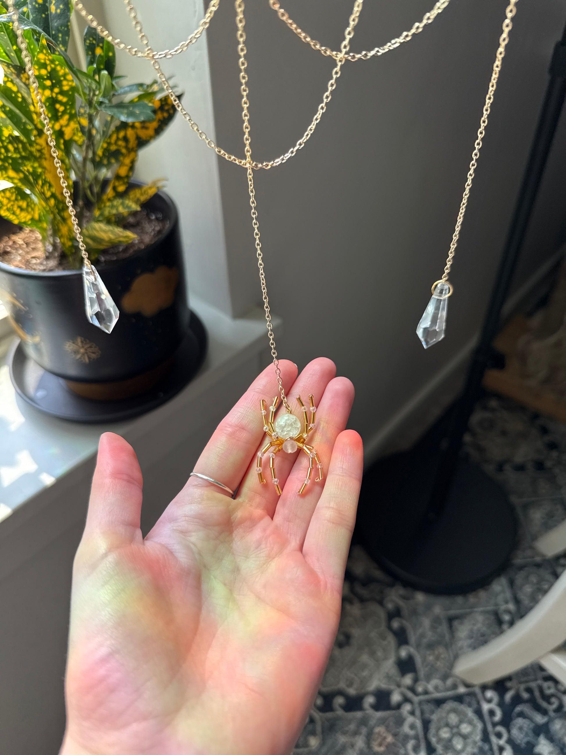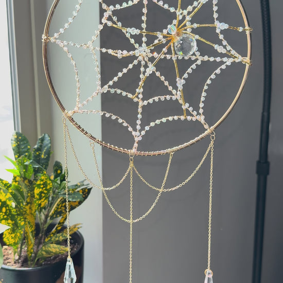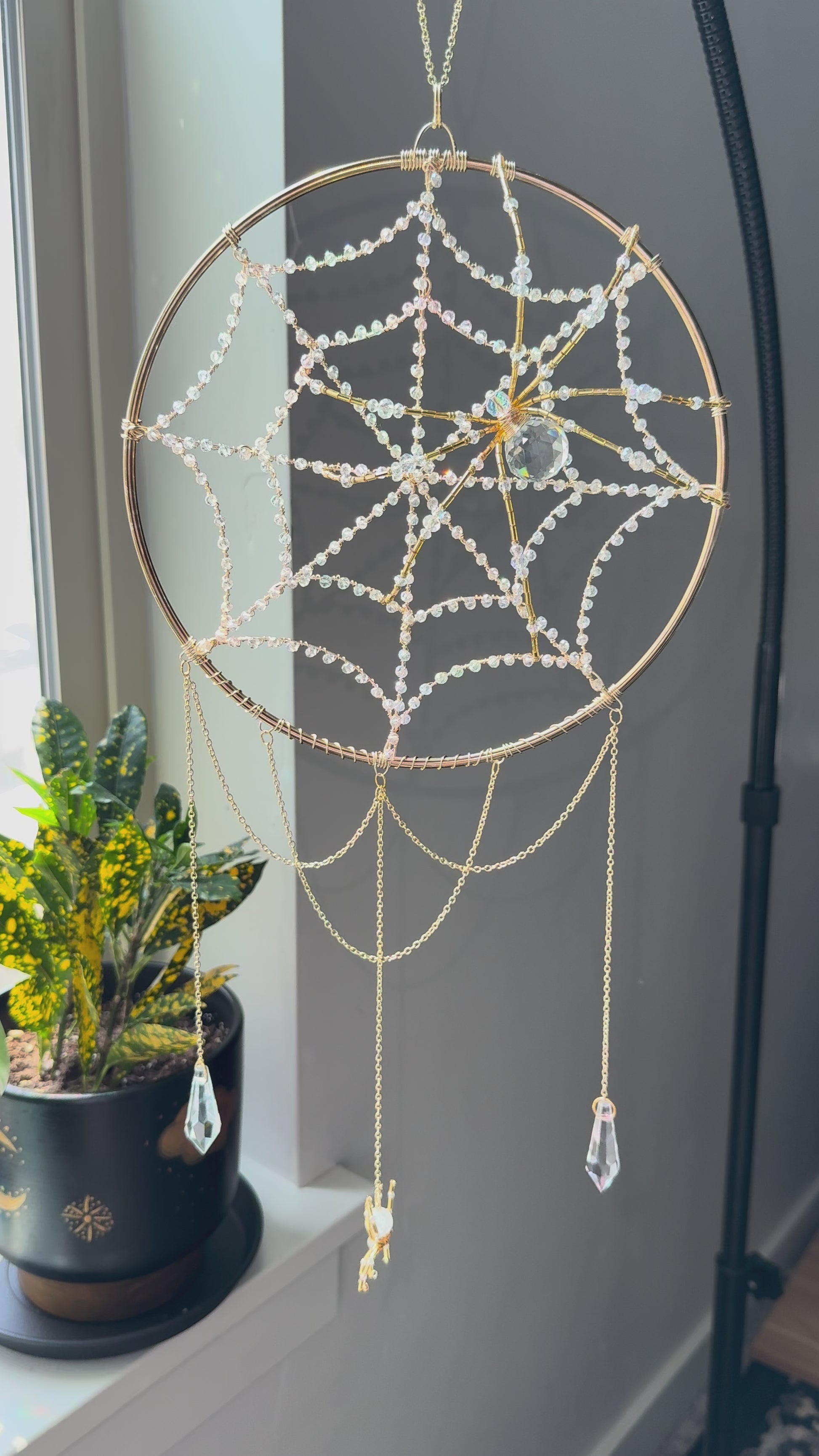 Like morning dew on a spider’s web, golden dew drop web sparkles with every shift of light. This handcrafted suncatcher features a delicately woven wire web, adorned with faceted glass beads, large golden spider made of wire, faceted beads, and large glass crystal that scatter rainbows across your space. Two elegant crystal drops hang below, each glimmering with soft, prismatic light, while a small golden spider rests at the center—an emblem of creativity, patience, and magic.