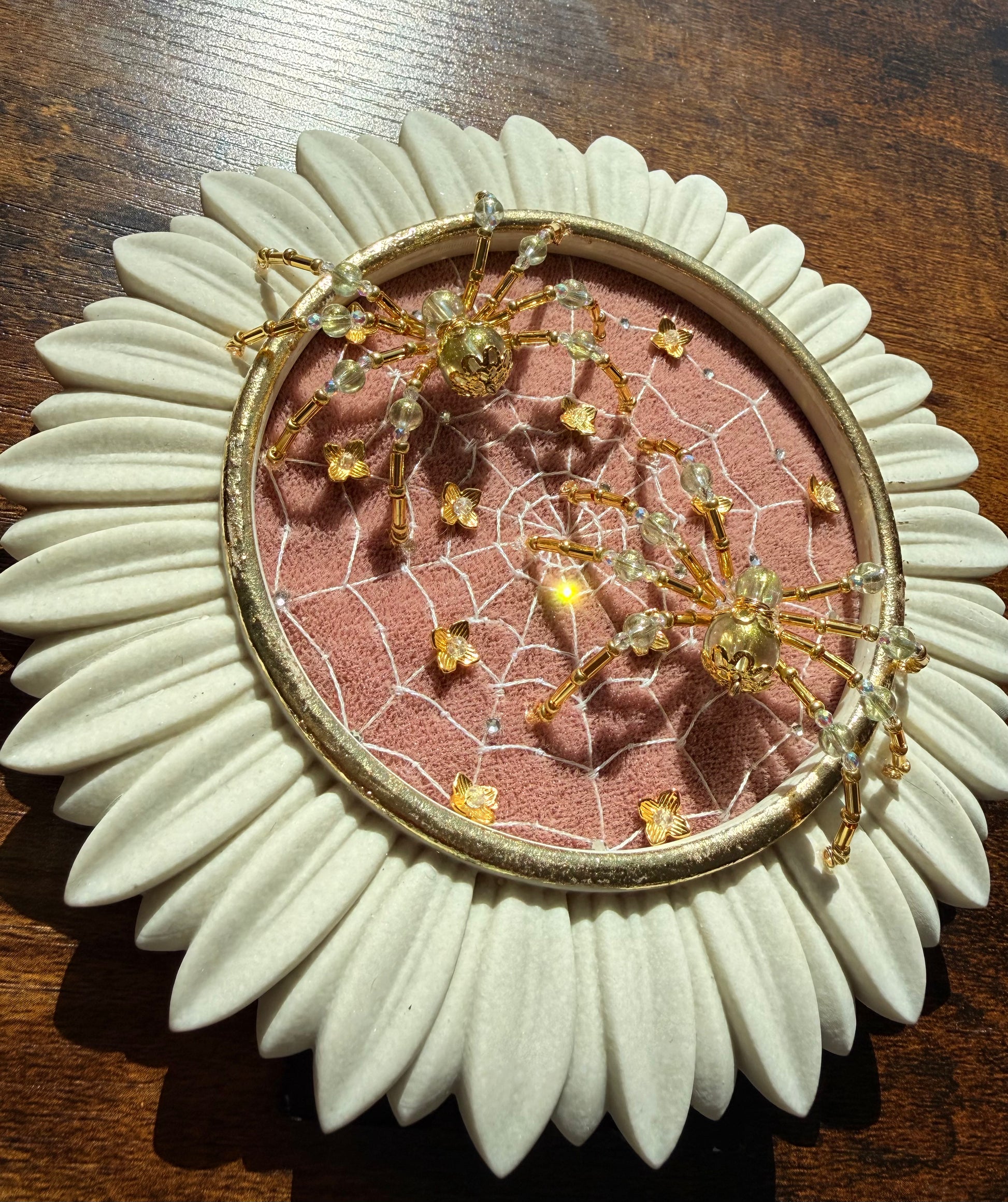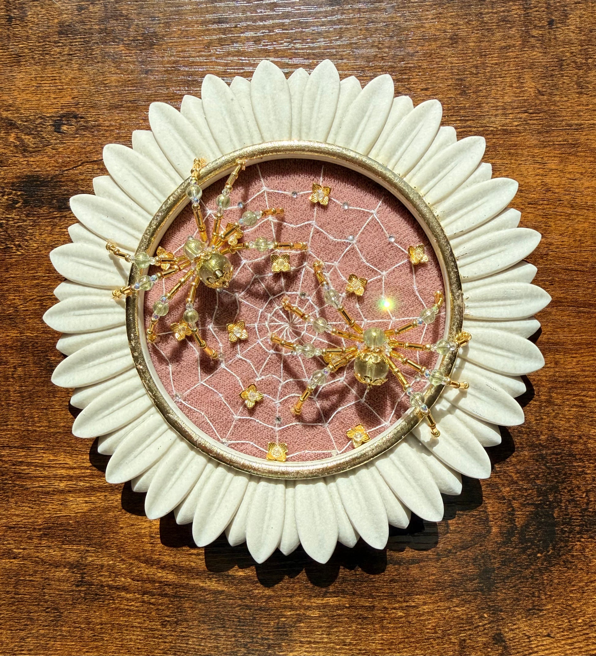 Guardians of spring. 🕷️🕸️✨🌸 embroidered web, beaded flowers, beaded spiders and lots of whimsical sparkle.
