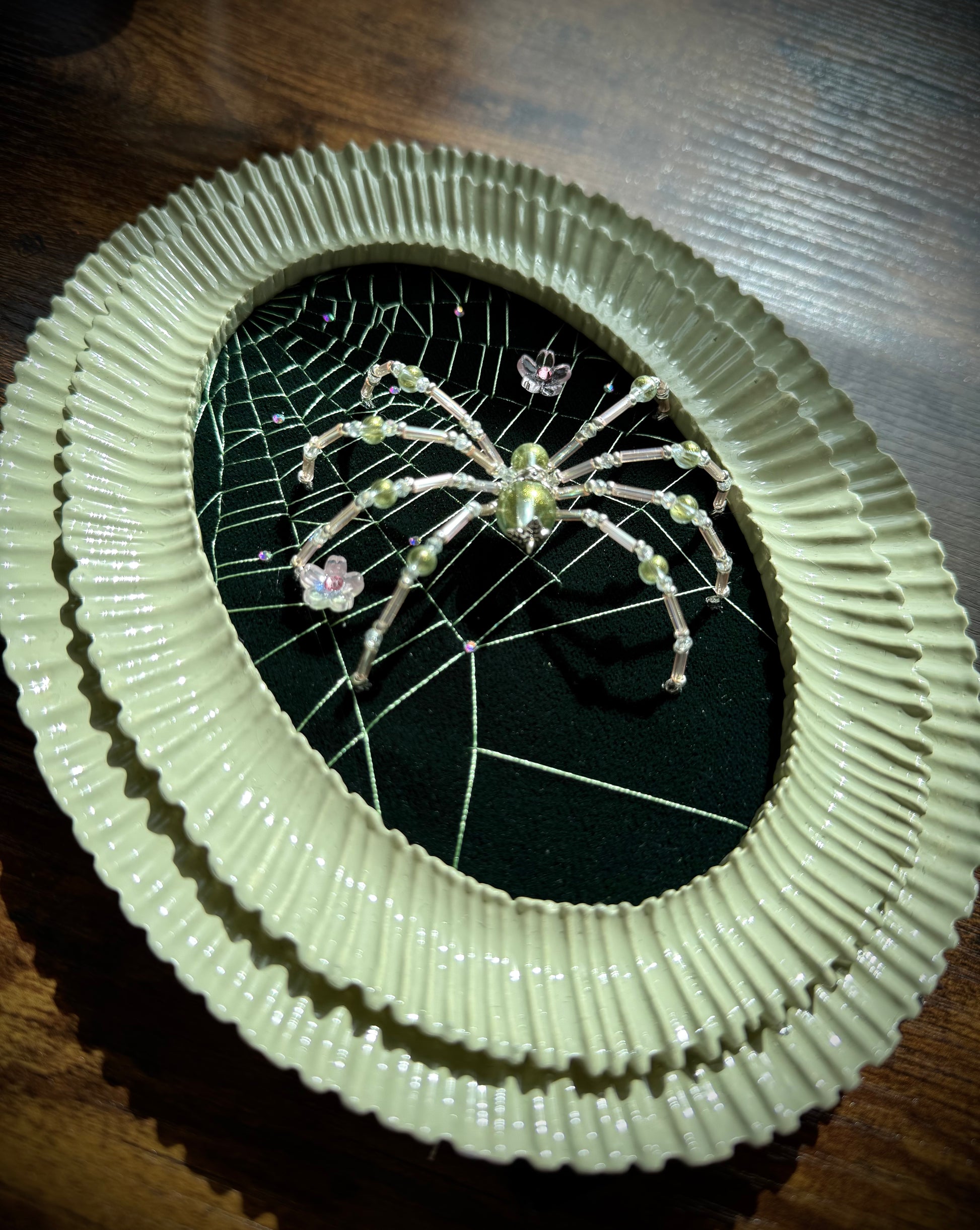 Light green Embroidered web on a dark green velvet background. Flower beads and rhinestones added to the web as accents with a green, pink and silver spider as the focal point. ๐๐ท๏ธโจ๐ธ