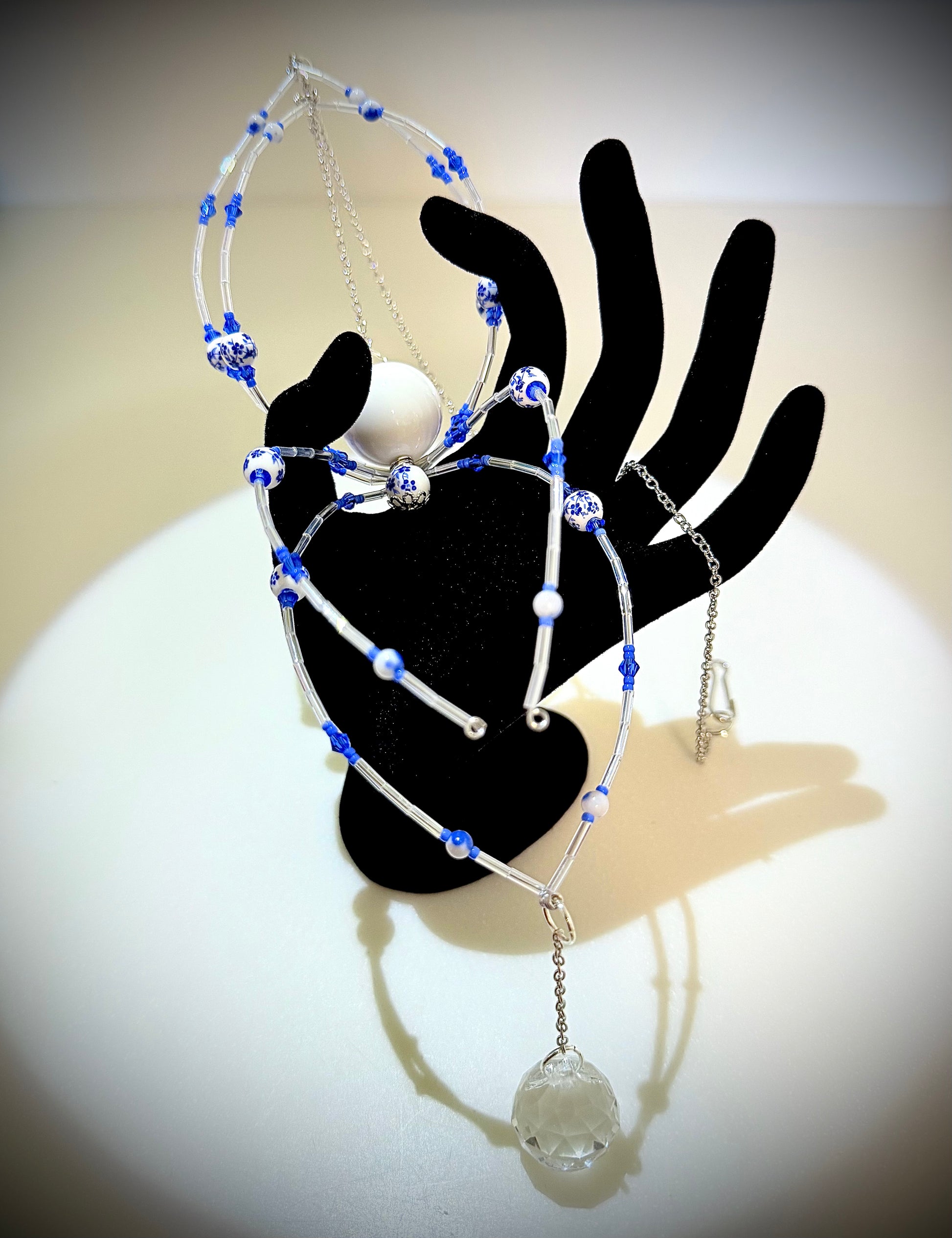 Delicate as a tea set passed down through generations, this porcelain-inspired spider weaves nostalgia into every strand. Featuring intricate blue-and-white floral beads reminiscent of vintage china, her slender glass limbs glimmer softly in the light. A luminous white “porcelain” body and crystal drop complete her timeless elegance, making her the perfect piece for lovers of heirlooms, artistry, and a touch of whimsy.
